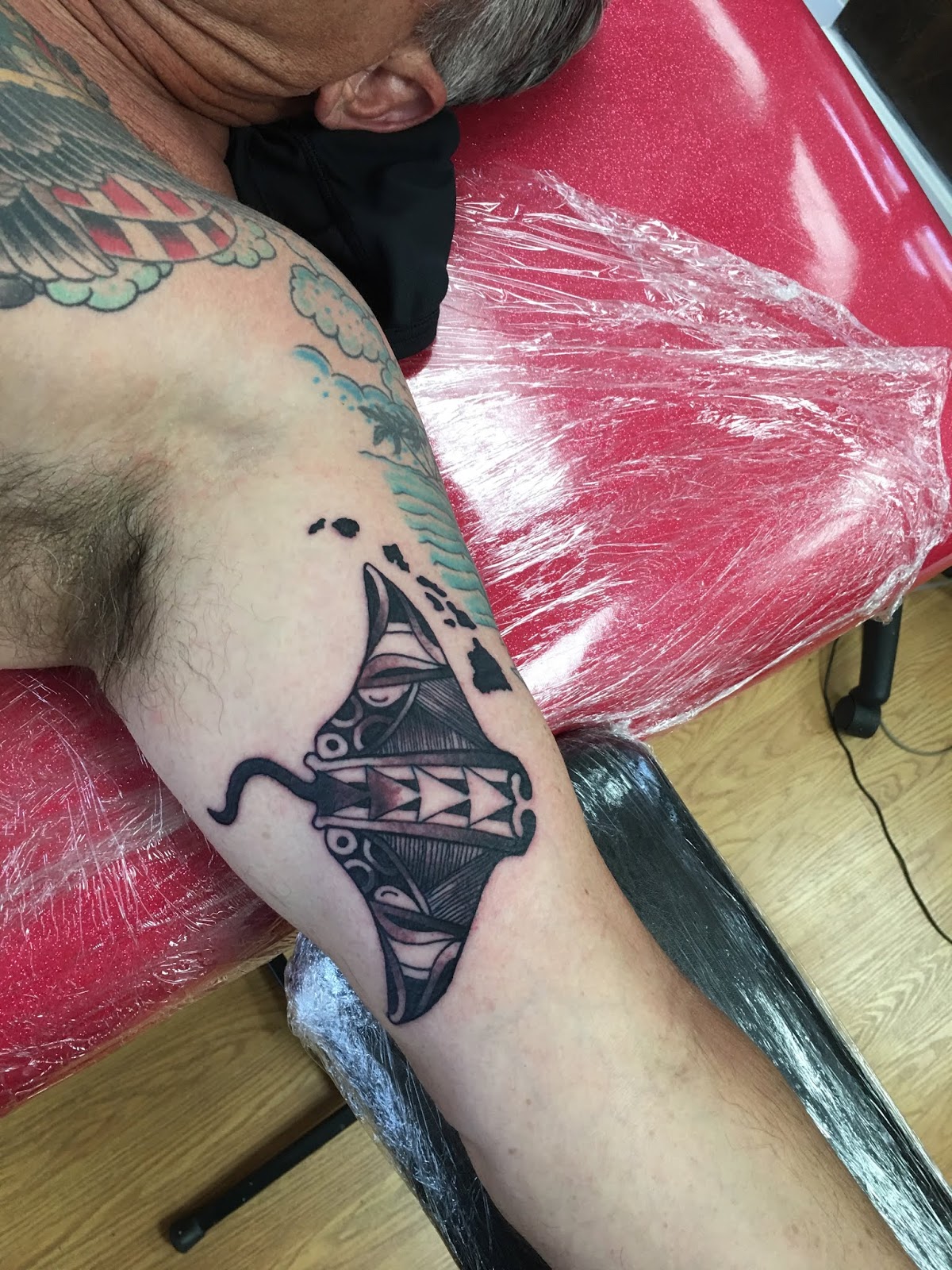 I do not make many Manta Ray tattoos. When I get the opportunity to tattoo one, its always fun and challenging because I am not as familiar with the basic forms of a