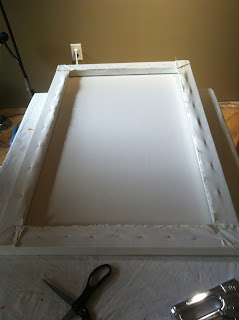 At this point you should have 20 staples into the mix.  Again divide the distance between each staple in half, stapling each half mark between all the staples around the entire frame.  We now have 36 staples in the mix.  Repeating this process again and again until the staples are between two and four inches apart.