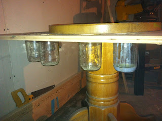 Then I epoxied the lids into the holes, using 4 grooved braid nails on the inside of each top to add the their stability to compensate for the torque when turning the jars out.  You can see the braids from the underside of the table.