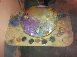 I needed a larger painting table, and a larger palette surface to work on so I decided to Frankenstein a painting table together with some furniture I dug up.
