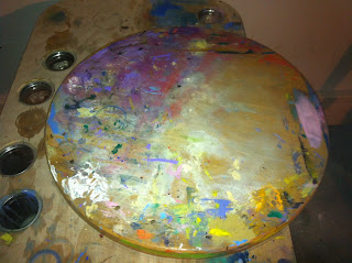 The palette is a 3-inch thick bar table top that I stripped and recoated with linseed oil rubbed into the wood with a rag.  A circular palette makes it easy for me to organize and mix my color selections.  I like to lay my colors out in a circle like the color wheel and this oak table top was perfect. Wood is the absolute best surface for an oil painting palette.